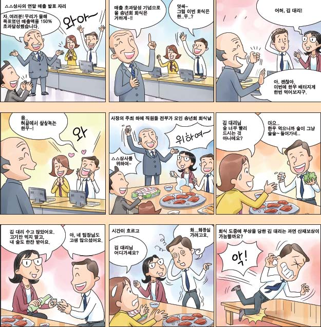 또한김 대리의 송년회 회식중 음주행위가 사업주의 만류 또는 제지에도 불구하고 자신의 독자적이고 자발적인 결단에 이루어진 것이 아니고 화장실을 가기 위해 이동하던 중 발생한 재해로서 순로를 이탈한 상황에서 발생한 재해 또한 아니므로 김 대리의 회식 중 사고는‘업무상 재해’로 인정받을 수 있습니다.
