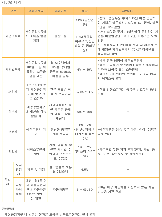 - 개성공업지구의 세금은 기업소득세, 개인소득세, 재산세, 상속세, 거래세, 영업세, 지방세 등으로 분류
